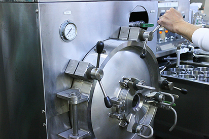 ポリエステルは約130度以上の高温で、圧力をかけながら染めるので、高圧染色機械を使います。